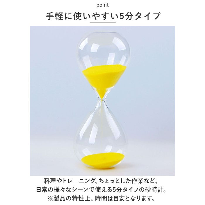 ・料理やトレーニング、ちょっとした作業など、日常の様々なシーンで使える5分タイプの砂時計。(※製品の特性上、時間は目安となります。)