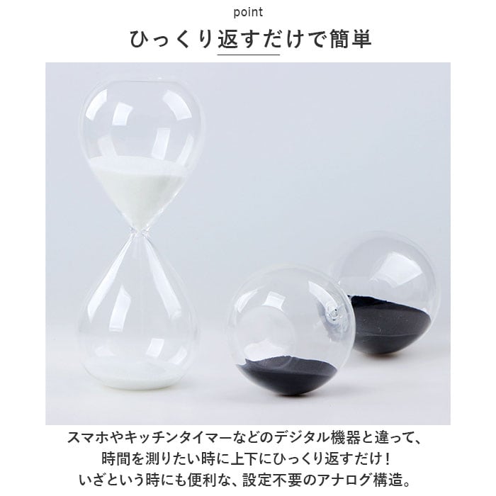・スマホやキッチンタイマーなどのデジタル機器と違って、時間を測りたい時に上下にひっくり返すだけ!いざという時にも便利な、設定不要のアナログ構造。
