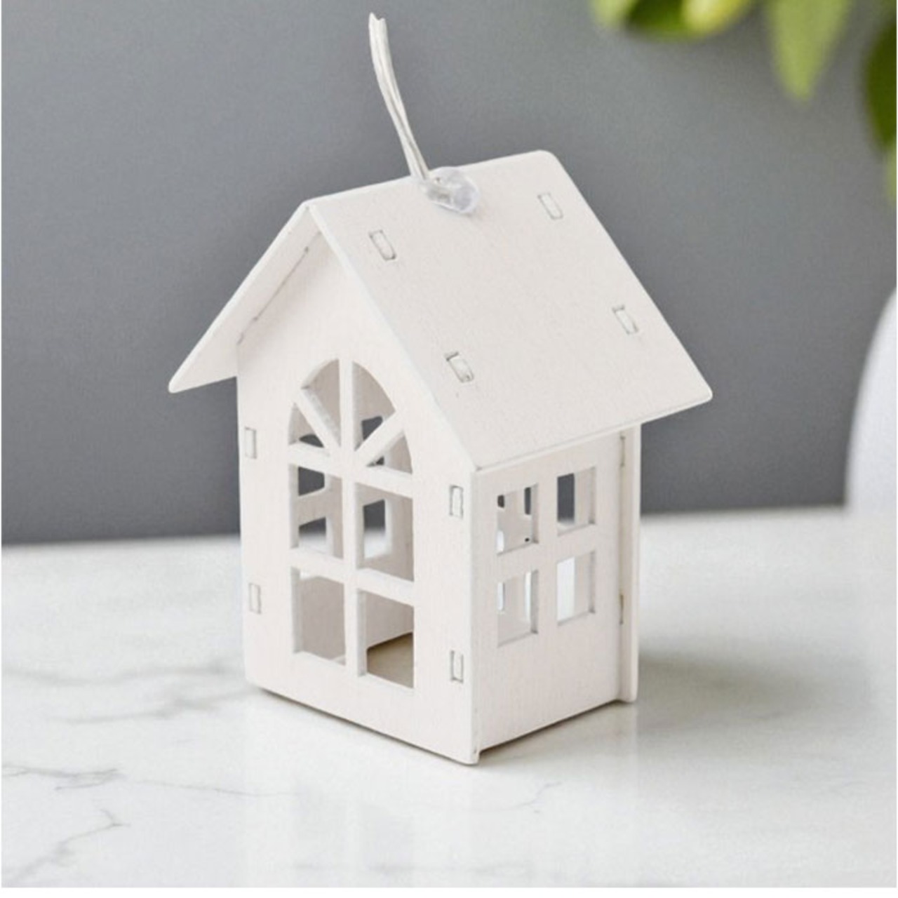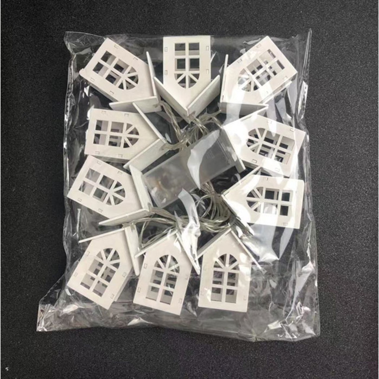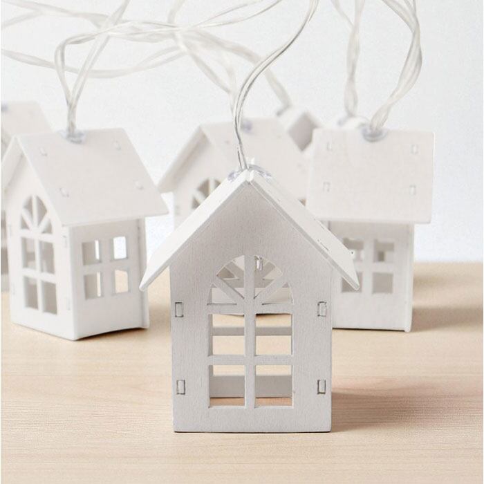 ・お家のカタチのライトを10個連ねた、ガーデンライト。柔らかな光で温かみのある空間に。