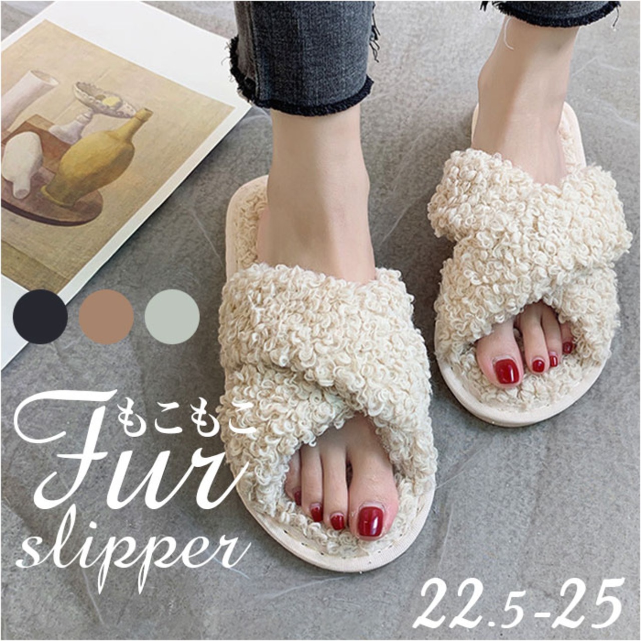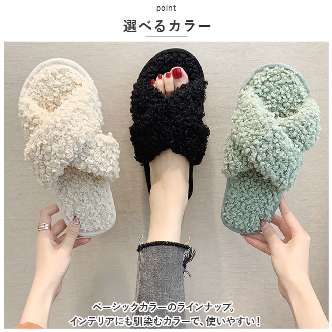 ・もこもこのフェイクファーが、足元を優しく包み込む。季節に合わせてスリッパも衣替え♪
