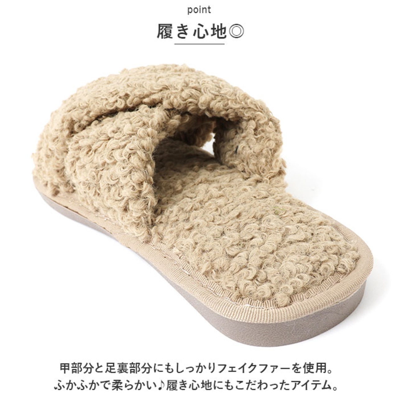 ・甲部分と足裏部分にもしっかりフェイクファーを使用。ふかふかで柔らかい♪履き心地にもこだわったアイテム。