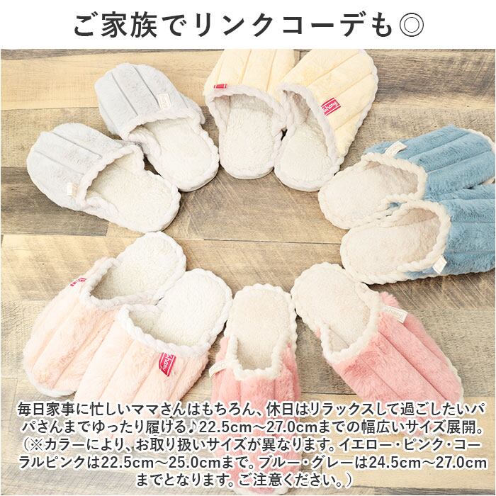 ・毎日家事に忙しいママさんはもちろん、休日はリラックスして過ごしたいパパさんまでゆったり履ける♪22.5cm~27.0cmまでの幅広いサイズ展開。(※カラーにより、お取り扱いサイズが異なります。イエロー・ピンク・コーラルピンクは22.5cm~25.0cmまで。ブルー・グレーは24.5cm~27.0cmまでとなります。ご注意ください。)