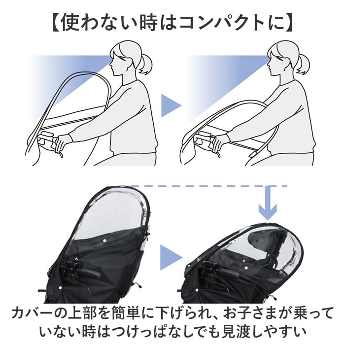 ・カバーの上部を簡単に下げられ、お子さまが乗っていない時はつけっぱなしでも見渡しやすい