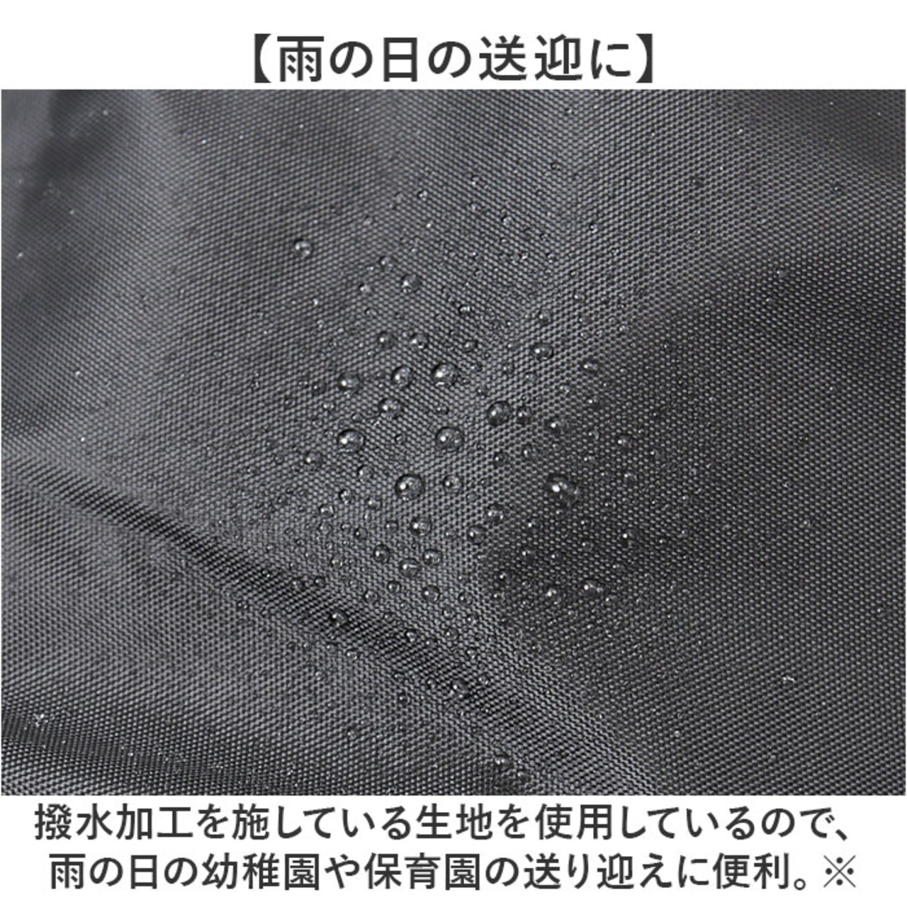 ・撥水加工を施している生地を使用しているので、雨の日の幼稚園や保育園の送り迎えに便利。※