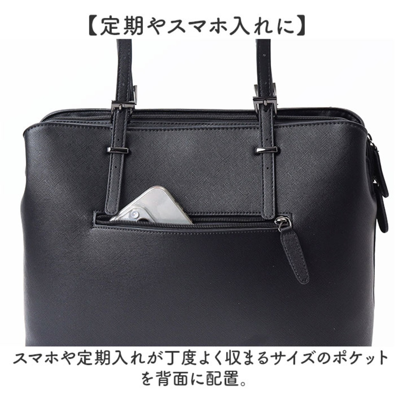 ・スマホや定期入れが丁度よく収まるサイズのポケットを背面に配置。