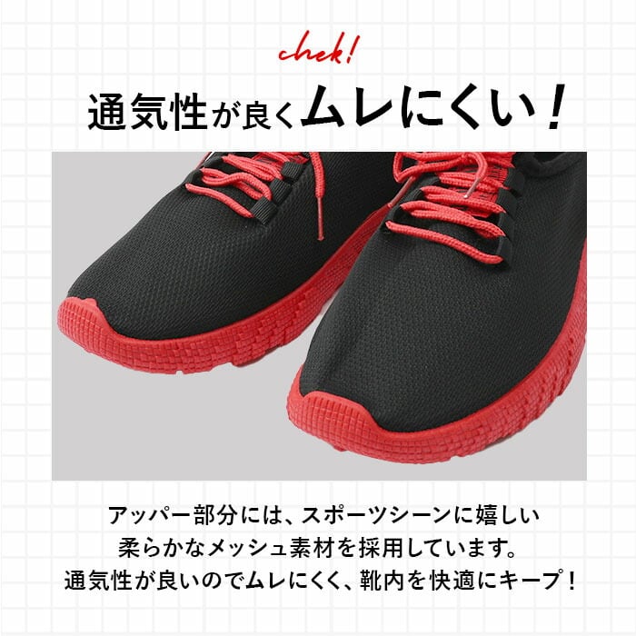 ・アッパー部分にはメッシュ素材を採用。通気性が良いのでムレにくい。靴内を快適にキープ。
