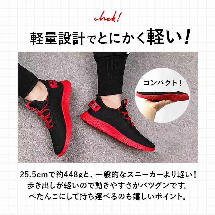 ・一般的なスニーカーよりも軽い、軽量設計。歩き出しが軽いので動きやすさがバツグン!ぺたんこにして持ち運べるのも嬉しい。