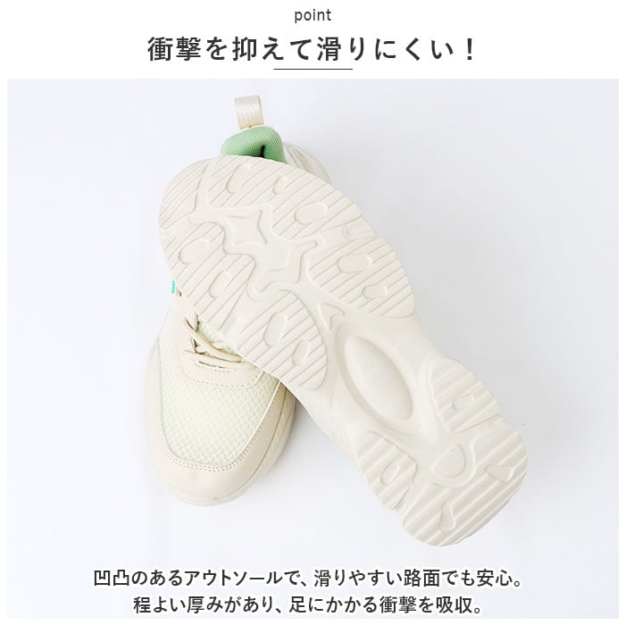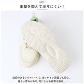 ・凹凸のあるアウトソールで、滑りやすい路面でも安心。程よい厚みがあり、足にかかる衝撃を吸収。