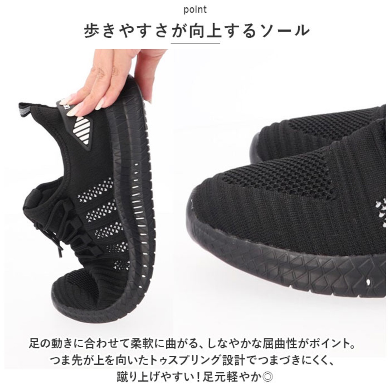 ・足の動きに合わせて柔軟に曲がる、しなやかな屈曲性がポイント。つま先が上を向いたトゥスプリング設計でつまづきにくく、蹴り上げやすい!足元軽やか◎
