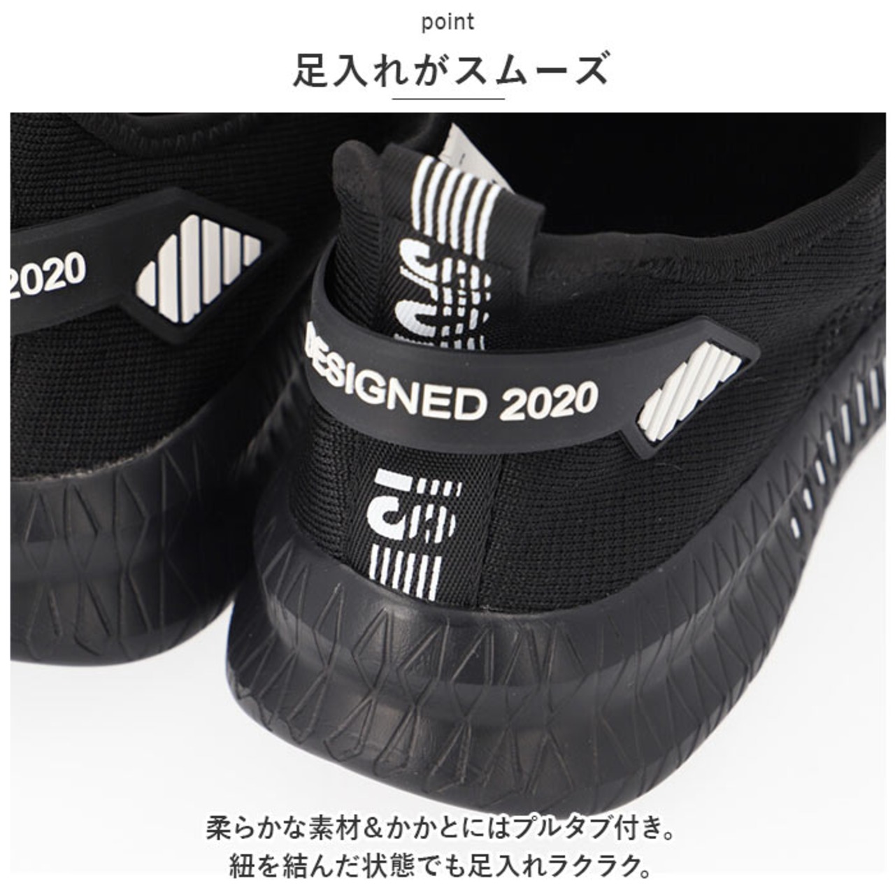 ・柔らかな素材&かかとにはプルタブ付き。紐を結んだ状態でも足入れラクラク。