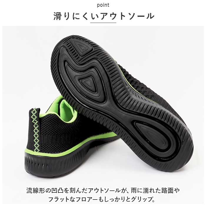 ・流線形の凹凸を刻んだアウトソールが、雨に濡れた路面やフラットなフロアーもしっかりとグリップ。
