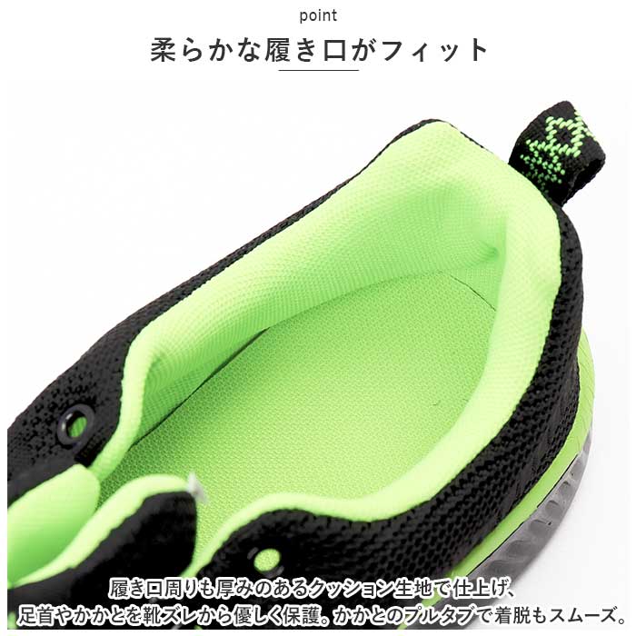 ・履き口周りも厚みのあるクッション生地で仕上げ、足首やかかとを靴ズレから優しく保護。かかとのプルタブで着脱もスムーズ。