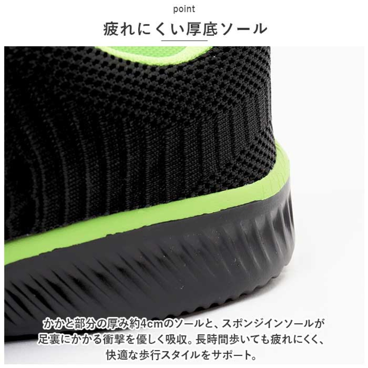 ・かかと部分の厚み約4cmのソールと、スポンジインソールが足裏にかかる衝撃を優しく吸収。長時間歩いても疲れにくく、快適な歩行スタイルをサポート。