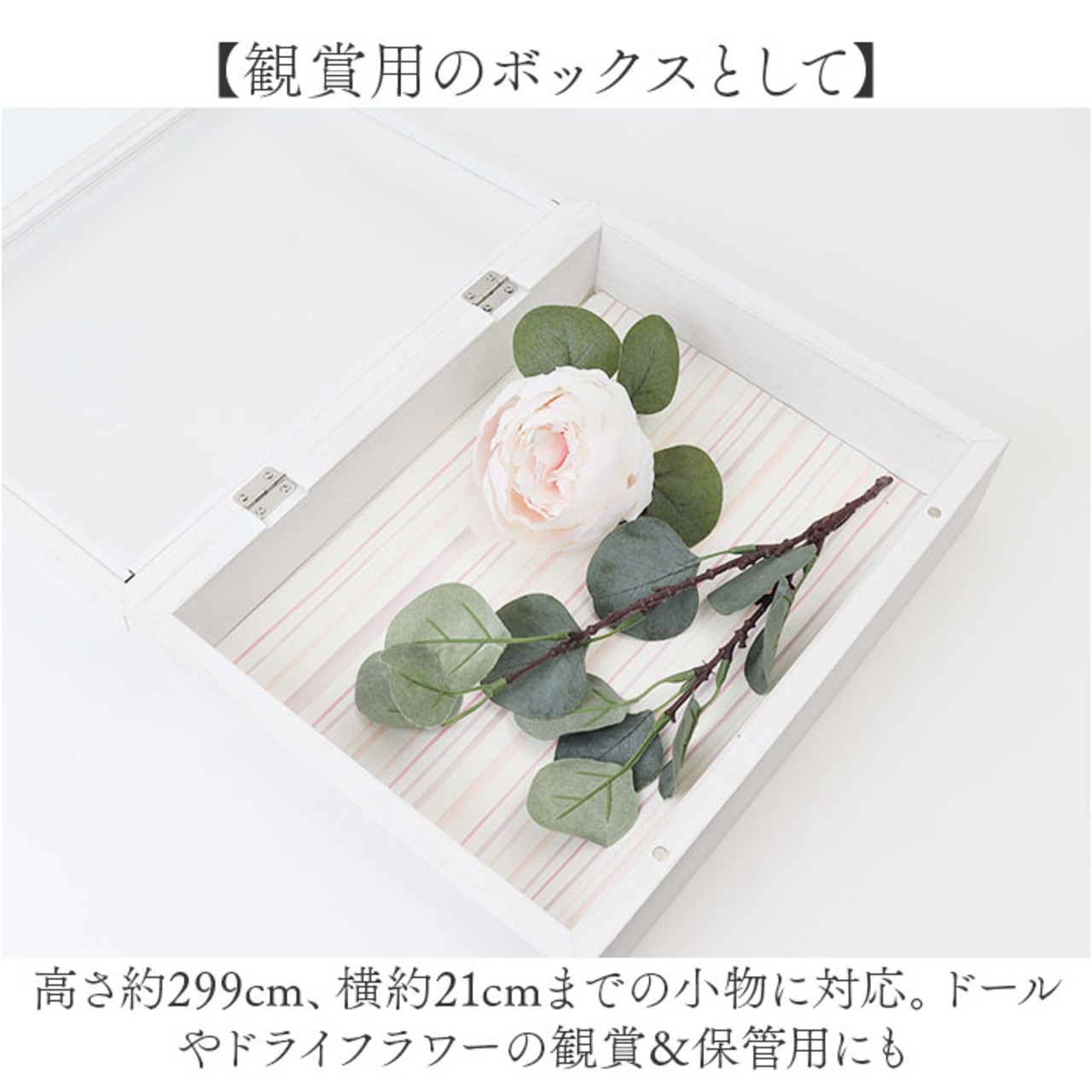 ・高さ約299cm、横約21cmまでの小物に対応。ドールやドライフラワーの観賞&保管用にも