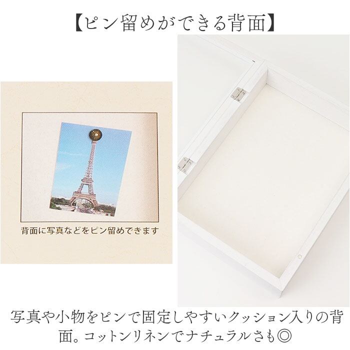 ・写真や小物をピンで固定しやすいクッション入りの背面。コットンリネンでナチュラルさも◎