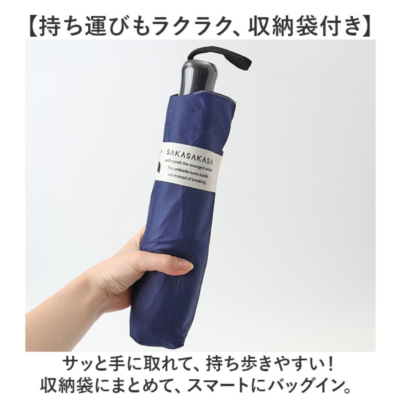 ・傘生地をまとめるバンドは、面ファスナー式。たたむ時も手間取らず、すっきりひとまとめ。