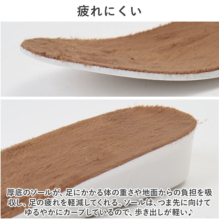 ・厚底のソールが、足にかかる体の重さや地面からの負担を吸収し、足の疲れを軽減してくれる。ソールは、つま先に向けてゆるやかにカーブしているので、歩き出しが軽い♪