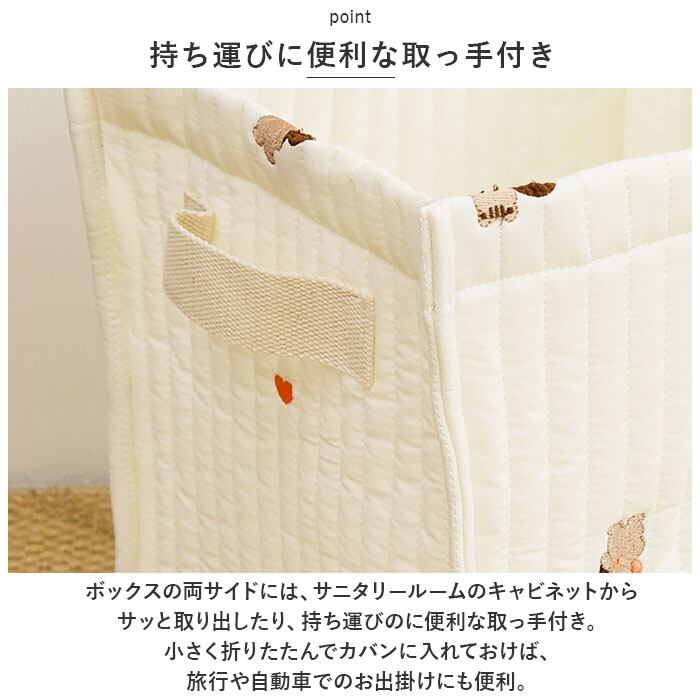 ・ボックスの両サイドには、サニタリールームのキャビネットからサッと取り出したり、持ち運びのに便利な取っ手付き。小さく折りたたんでカバンに入れておけば、旅行や自動車でのお出掛けにも便利。