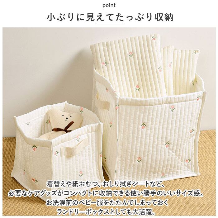 ・赤ちゃんがうっかりぶつかっても安心なふんわり軽いキルティング素材。アニマルフェイスやフラワー柄の可愛い刺繍がアクセントになった布製ポーチボックス。