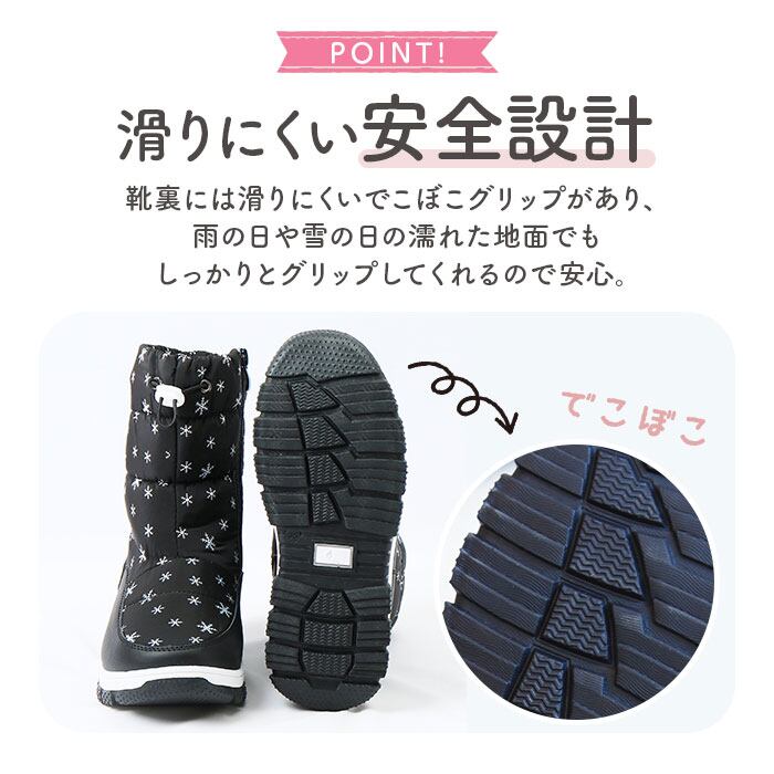 ・靴裏には滑りにくいよう加工を施し、歩きやすさに配慮。雨の日や雪の日の濡れた地面でもしっかりとグリップしてくれる安心の仕様。