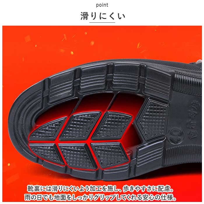 ・靴裏には滑りにくいよう加工を施し、歩きやすさに配慮。雨の日でも地面をしっかりグリップしてくれる安心の仕様。