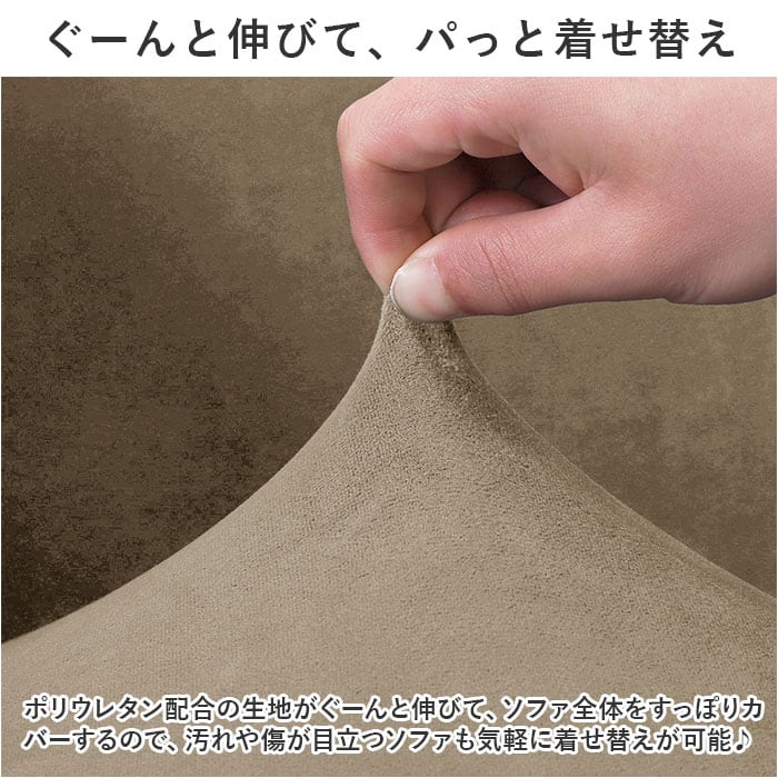 ・ポリウレタン配合の生地がぐーんと伸びて、ソファ全体をすっぽりカバーするので、汚れや傷が目立つソファも気軽に着せ替えが可能♪