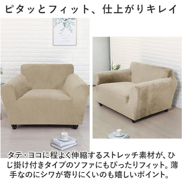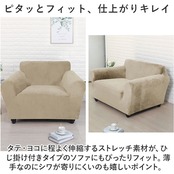 ・タテ・ヨコに程よく伸縮するストレッチ素材が、ひじ掛け付きタイプのソファにもぴったりフィット。薄手なのにシワが寄りにくいのも嬉しいポイント。