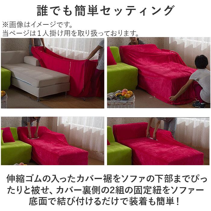 ・伸縮ゴムの入ったカバー裾をソファの下部までぴったりと被せ、カバー裏側の2組の固定紐をソファー底面で結び付けるだけで装着も簡単!