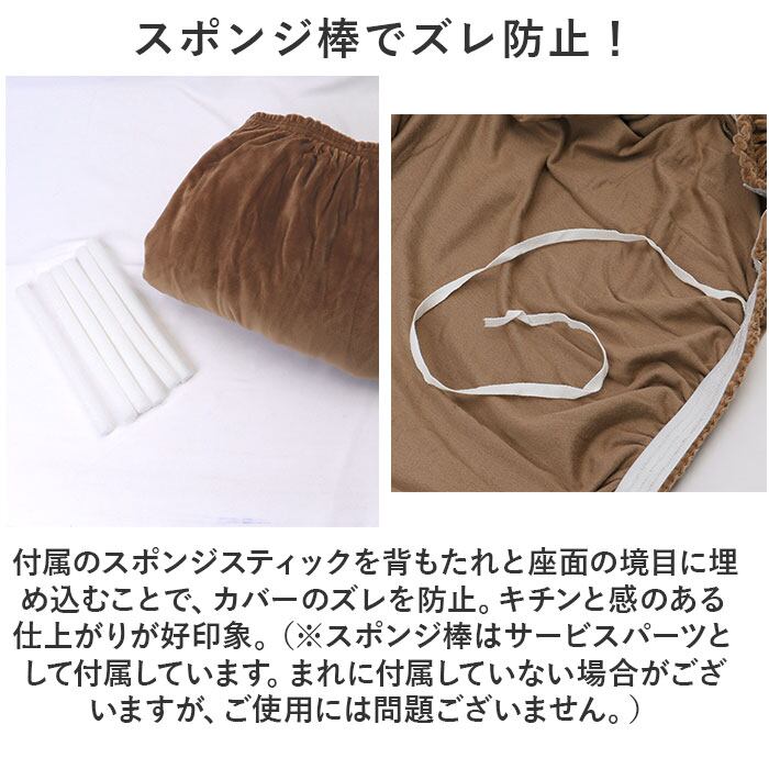・付属のスポンジスティックを背もたれと座面の境目に埋め込むことで、カバーのズレを防止。キチンと感のある仕上がりが好印象。(※スポンジ棒はサービスパーツとして付属しています。まれに付属していない場合がございますが、ご使用には問題ございません。)