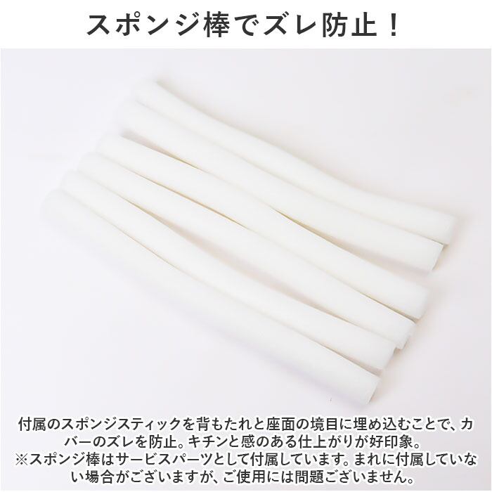 ・付属のスポンジスティックを背もたれと座面の境目に埋め込むことで、カバーのズレを防止。キチンと感のある仕上がりが好印象。(※スポンジ棒はサービスパーツとして付属しています。まれに付属していない場合がございますが、ご使用には問題ございません。)