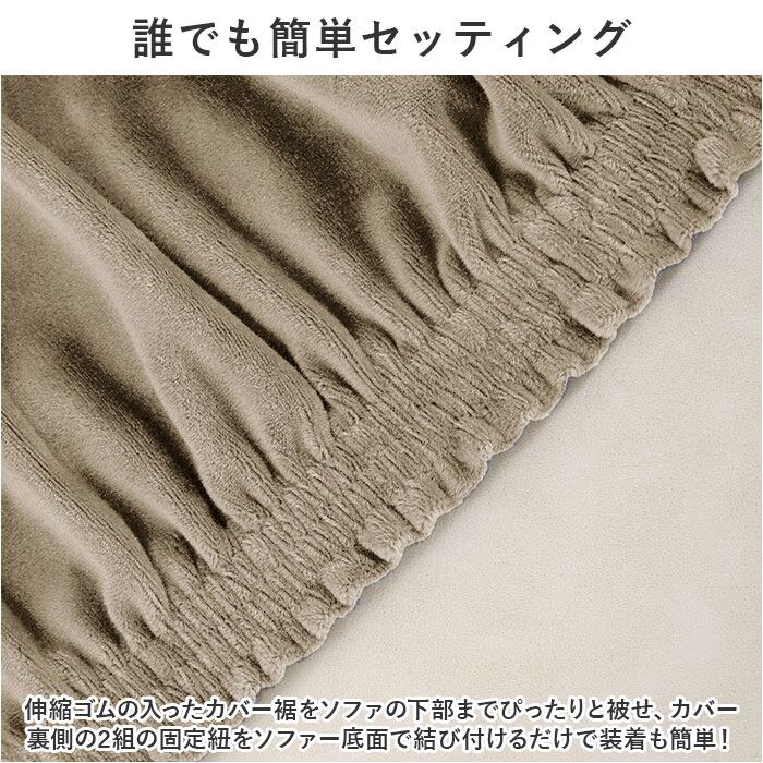 ・伸縮ゴムの入ったカバー裾をソファの下部までぴったりと被せ、カバー裏側の2組の固定紐をソファー底面で結び付けるだけで装着も簡単!