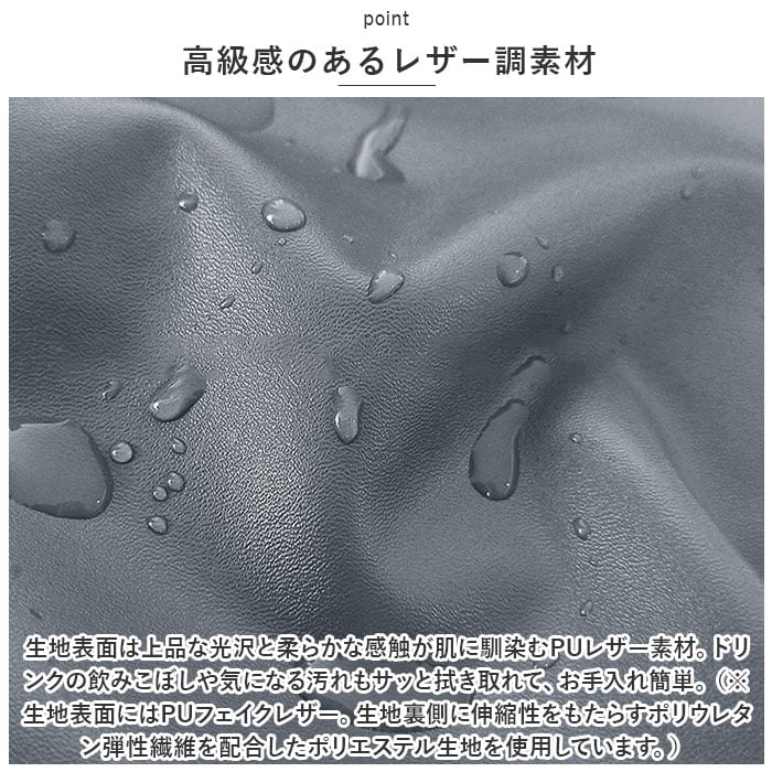 ・生地表面は上品な光沢と柔らかな感触が肌に馴染むPUレザー素材。ドリンクの飲みこぼしや気になる汚れもサッと拭き取れて、お手入れ簡単。(※生地表面にはPUフェイクレザー。生地裏側に伸縮性をもたらすポリウレタン弾性繊維を配合したポリエステル生地を使用しています。)