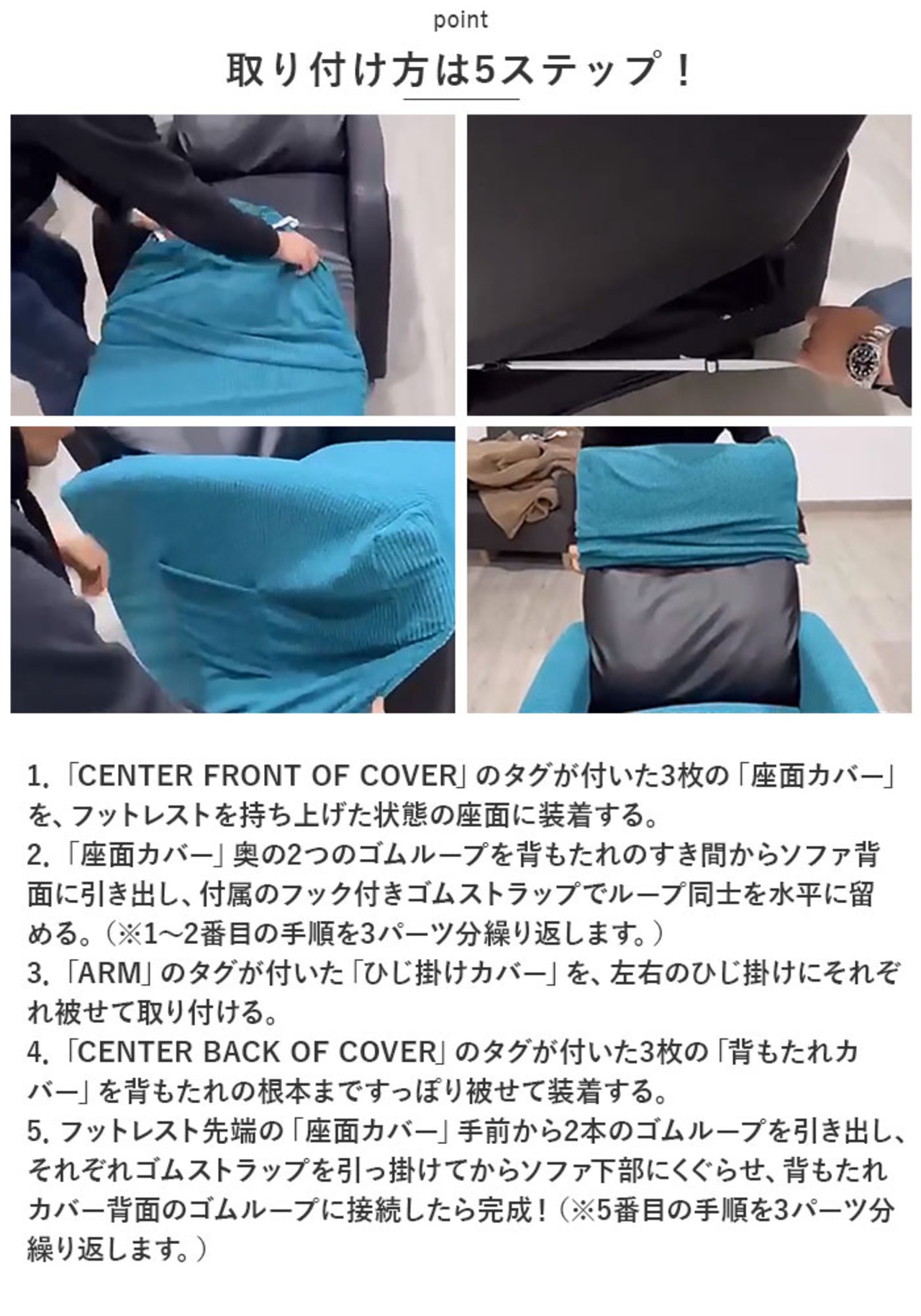 5.フットレスト先端の「座面カバー」手前から2本のゴムループを引き出し、それぞれゴムストラップを引っ掛けてからソファ下部にくぐらせ、背もたれカバー背面のゴムループに接続したら完成!(※5番目の手順を3パーツ分繰り返します。)