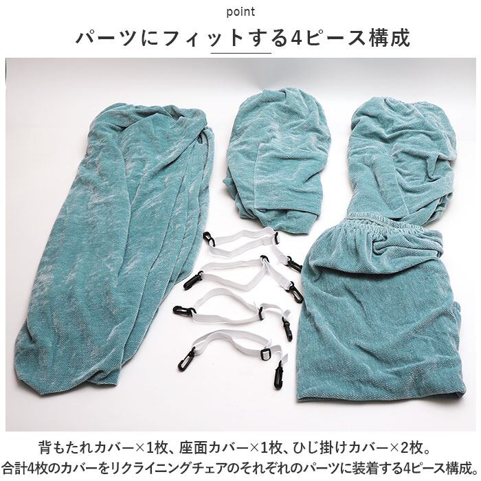 ・背もたれカバー×1枚、座面カバー×1枚、ひじ掛けカバー×2枚。合計4枚のカバーをリクライニングチェアのそれぞれのパーツに装着する4ピース構成。