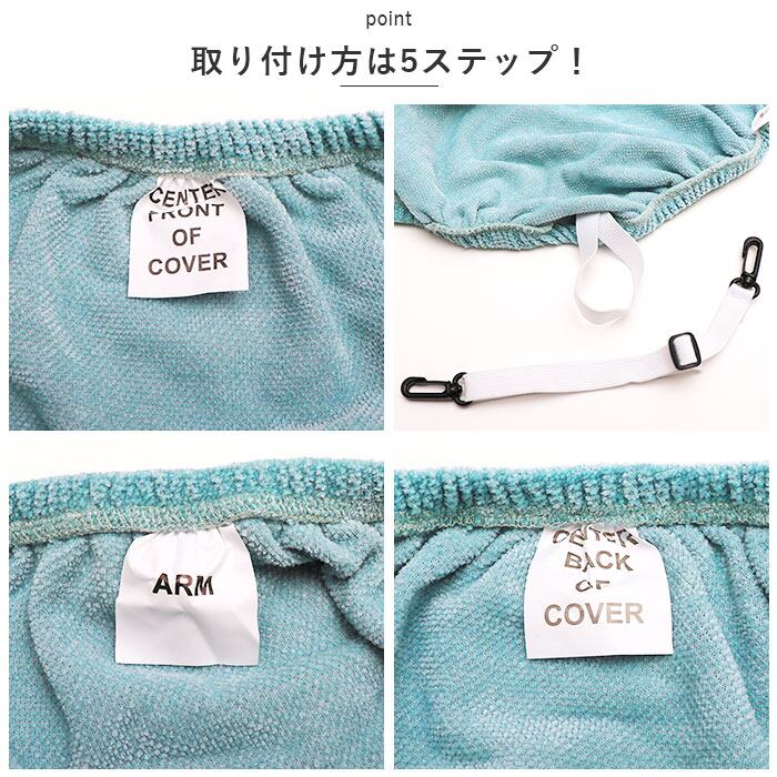 3.「ARM」のタグが付いた「ひじ掛けカバー」を、左右のひじ掛けにそれぞれ被せて取り付ける。