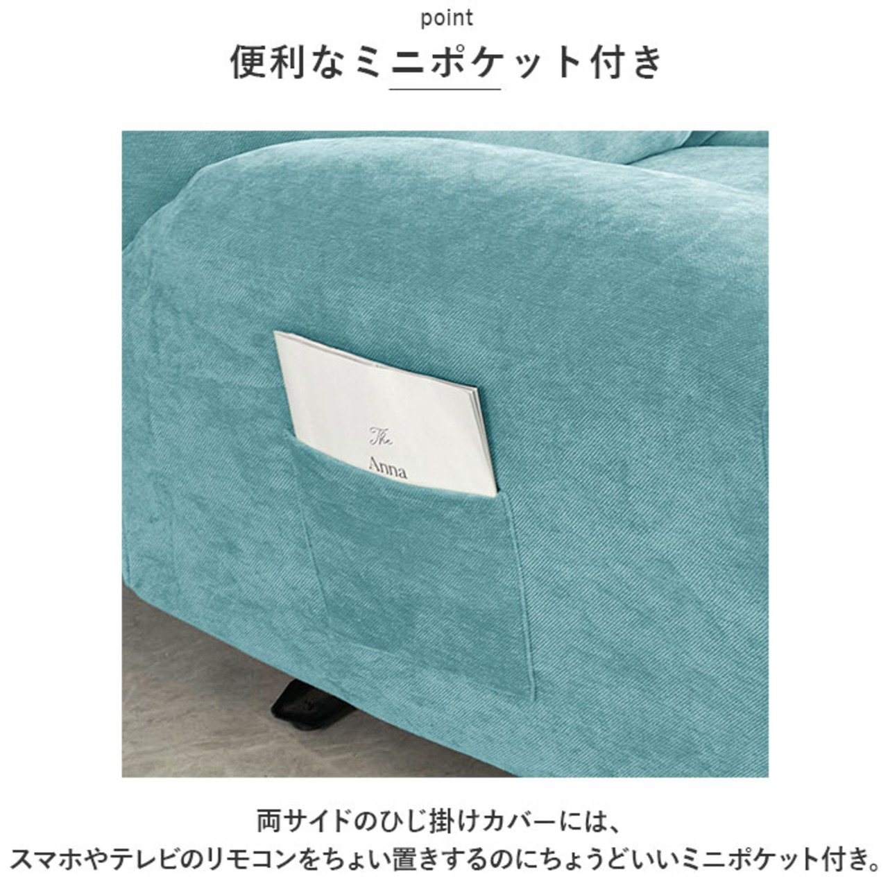 ・両サイドのひじ掛けカバーには、スマホやテレビのリモコンをちょい置きするのにちょうどいいミニポケット付き。