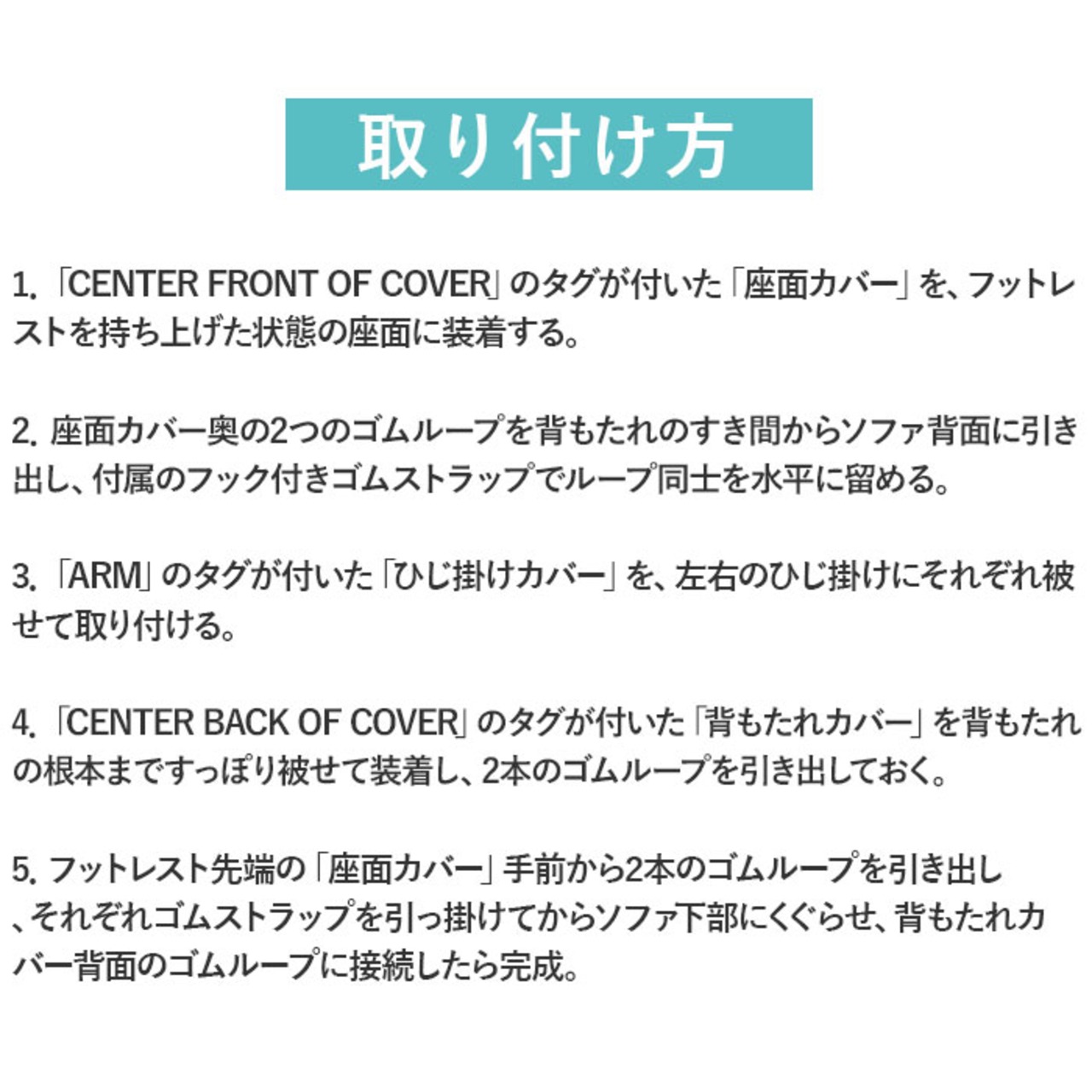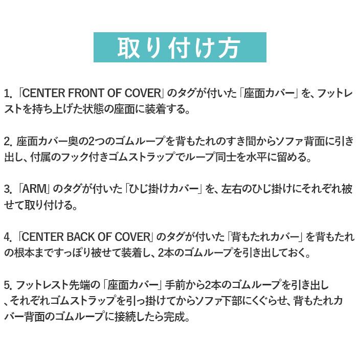 5.フットレスト先端の「座面カバー」手前から2本のゴムループを引き出し、それぞれゴムストラップを引っ掛けてからソファ下部にくぐらせ、背もたれカバー背面のゴムループに接続したら完成。