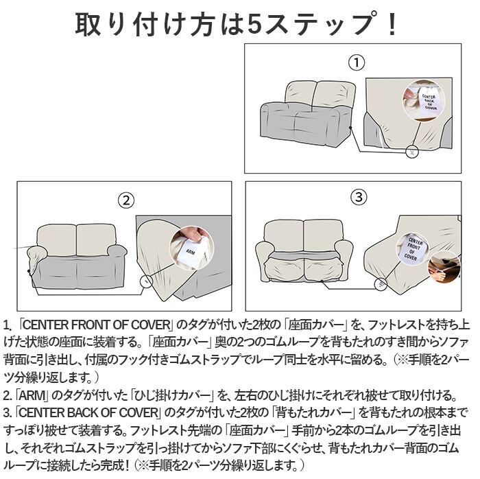 ・背もたれカバー×2枚、座面カバー×2枚、ひじ掛けカバー×2枚。合計6枚のカバーをリクライニングソファのそれぞれのパーツに装着する6ピース構成。