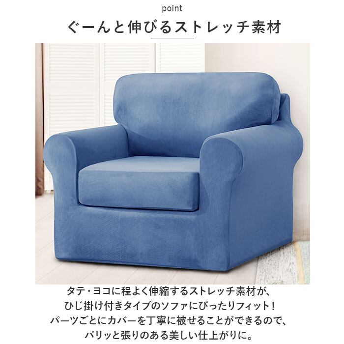 ・タテ・ヨコに程よく伸縮するストレッチ素材が、ひじ掛け付きタイプのソファにぴったりフィット!パーツごとにカバーを丁寧に被せることができるので、パリッと張りのある美しい仕上がりに。
