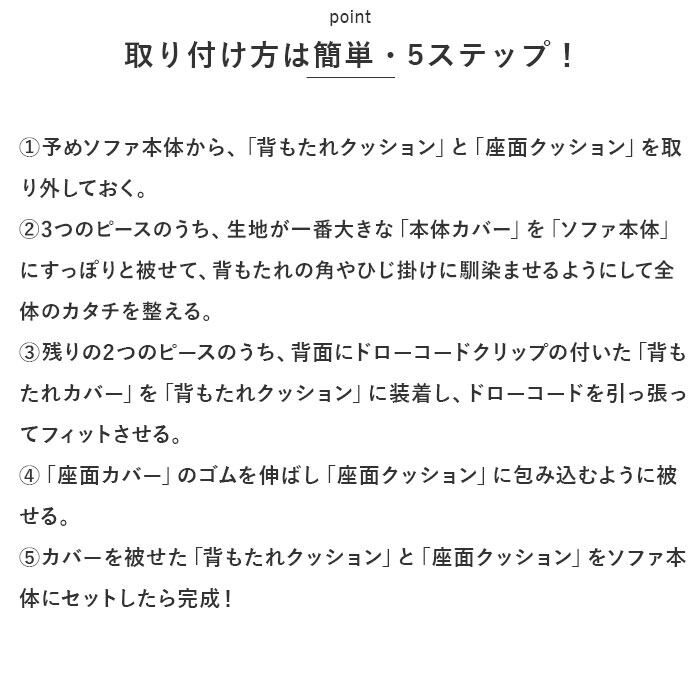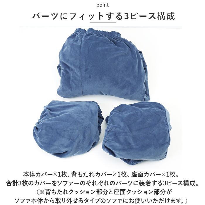・本体カバー×1枚、背もたれカバー×1枚、座面カバー×1枚。合計3枚のカバーをソファーのそれぞれのパーツに装着する3ピース構成。(※背もたれクッション部分と座面クッション部分がソファ本体から取り外せるタイプのソファにお使いいただけます。)
