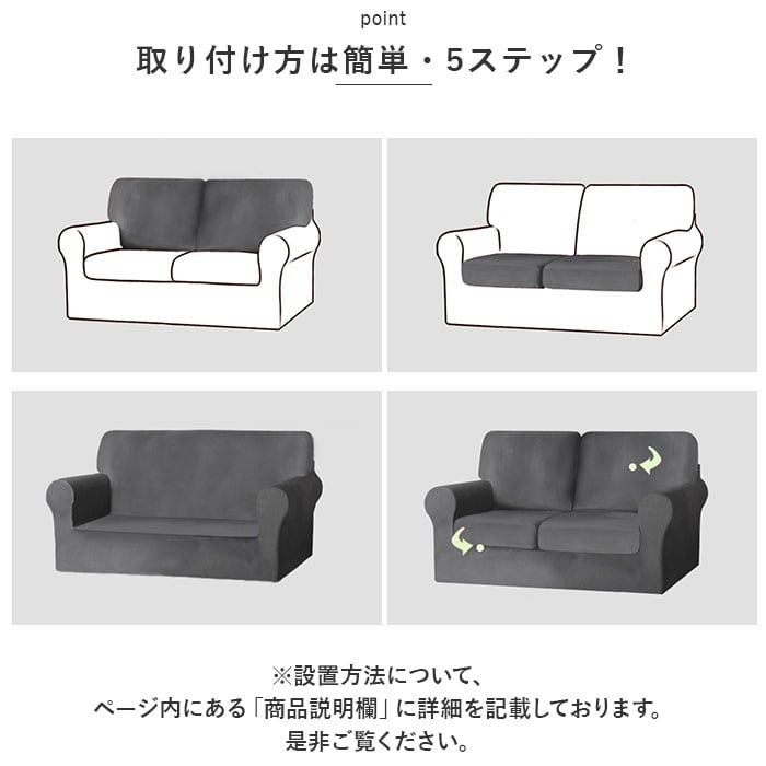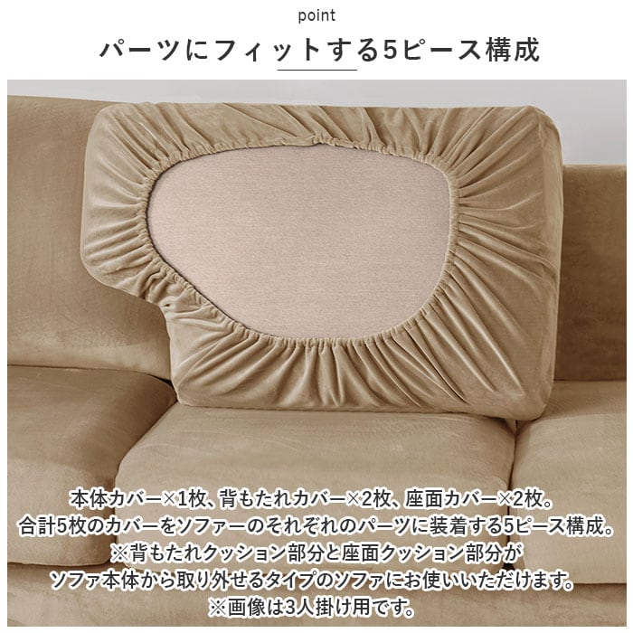 ・本体カバー×1枚、背もたれカバー×2枚、座面カバー×2枚。合計5枚のカバーをソファーのそれぞれのパーツに装着する5ピース構成。(※背もたれクッション部分と座面クッション部分がソファ本体から取り外せるタイプのソファにお使いいただけます。)