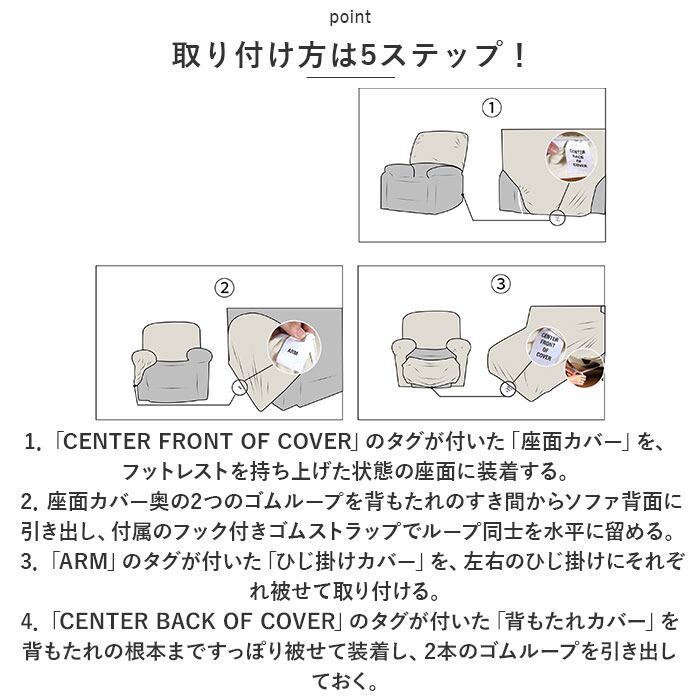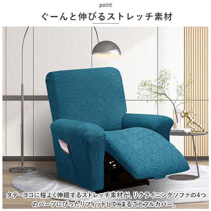 ・タテ・ヨコに程よく伸縮するストレッチ素材が、リクライニングソファの4つのパーツにぴったりフィットして、まるごとフルカバー。