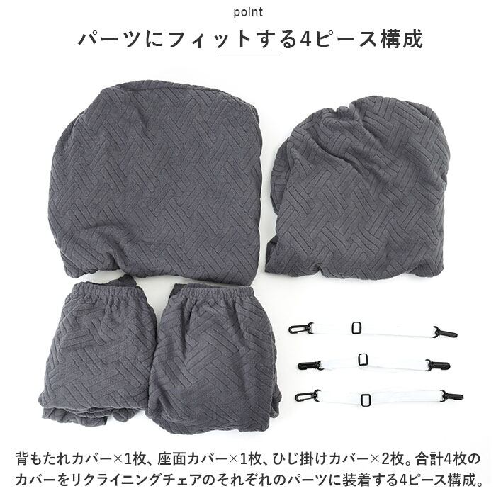 ・背もたれカバー×1枚、座面カバー×1枚、ひじ掛けカバー×2枚。合計4枚のカバーをリクライニングチェアのそれぞれのパーツに装着する4ピース構成。