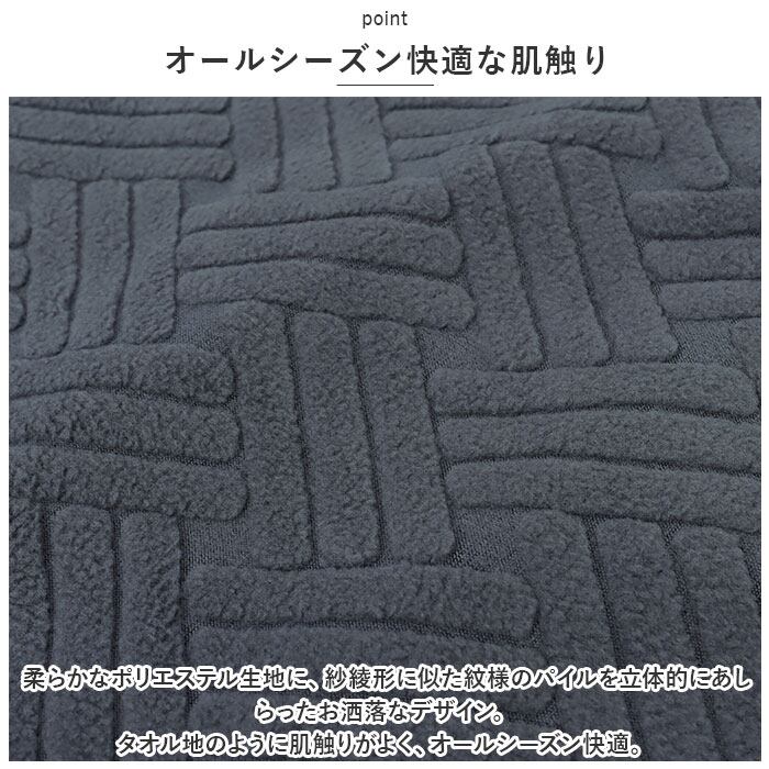 ・柔らかなポリエステル生地に、紗綾形に似た紋様のパイルを立体的にあしらったお洒落なデザイン。タオル地のように肌触りがよく、オールシーズン快適。