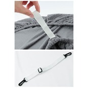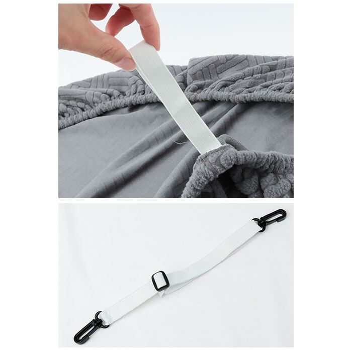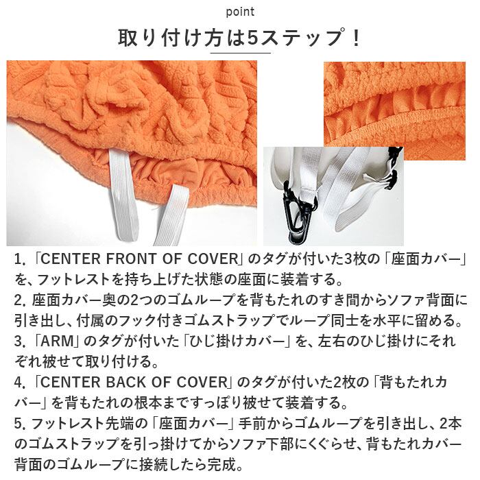 5.フットレスト先端の「座面カバー」手前からゴムループを引き出し、2本のゴムストラップを引っ掛けてからソファ下部にくぐらせ、背もたれカバー背面のゴムループに接続したら完成。