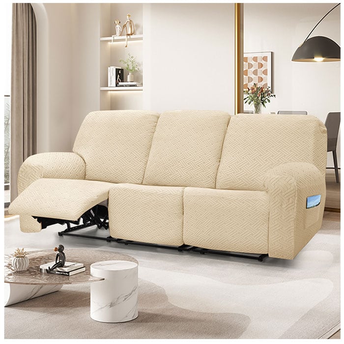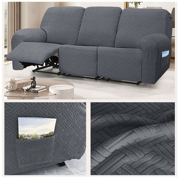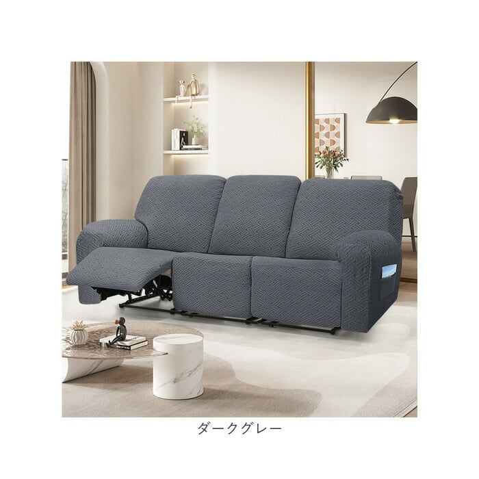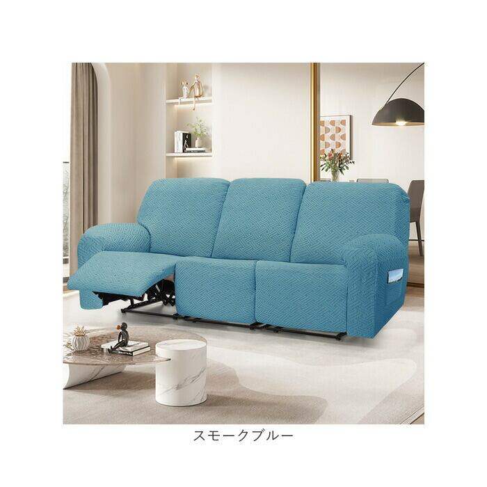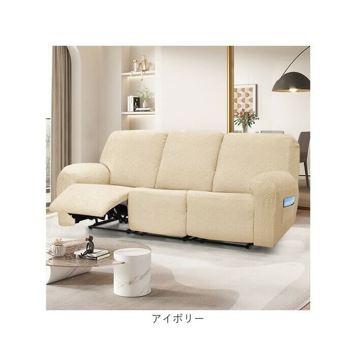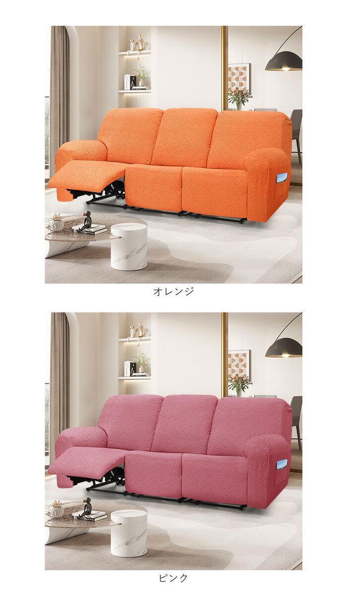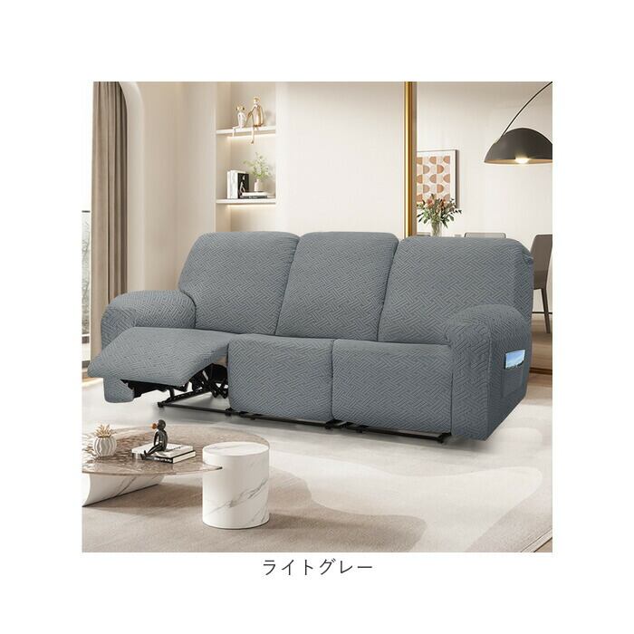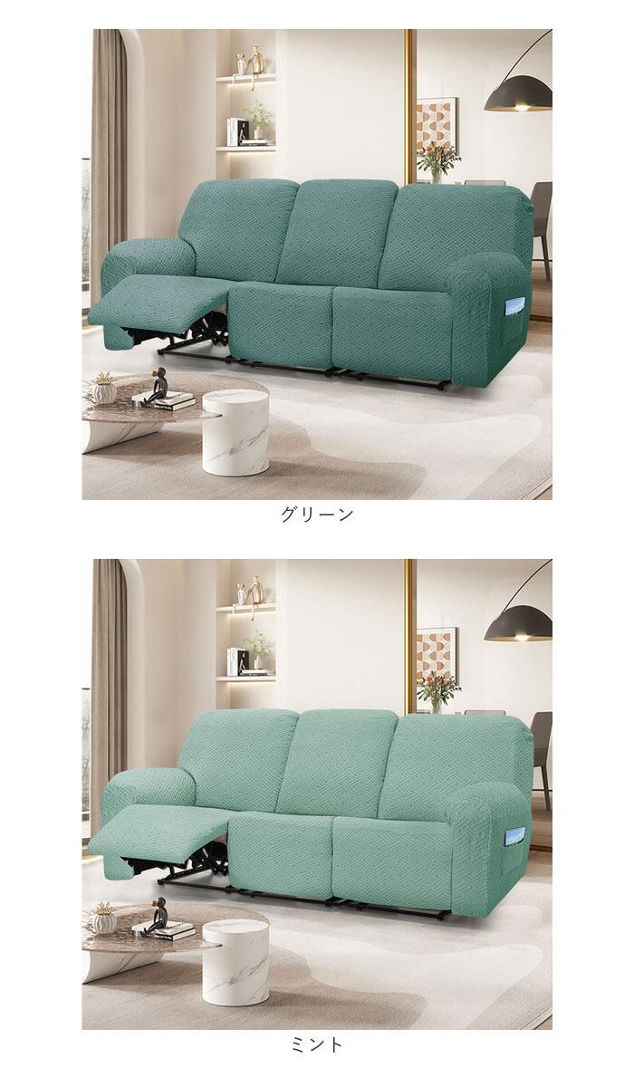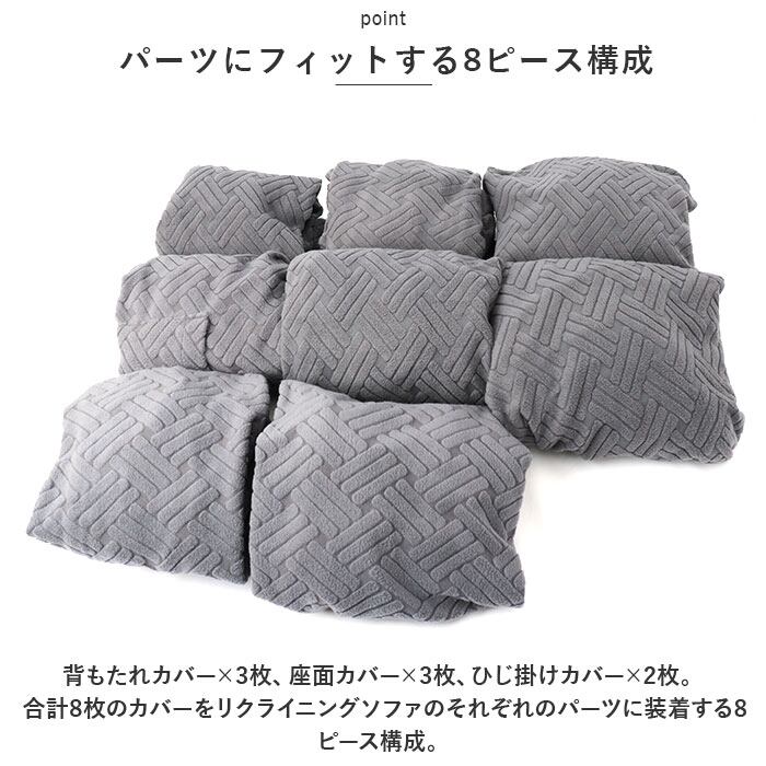・背もたれカバー×3枚、座面カバー×3枚、ひじ掛けカバー×2枚。合計8枚のカバーをリクライニングソファのそれぞれのパーツに装着する8ピース構成。