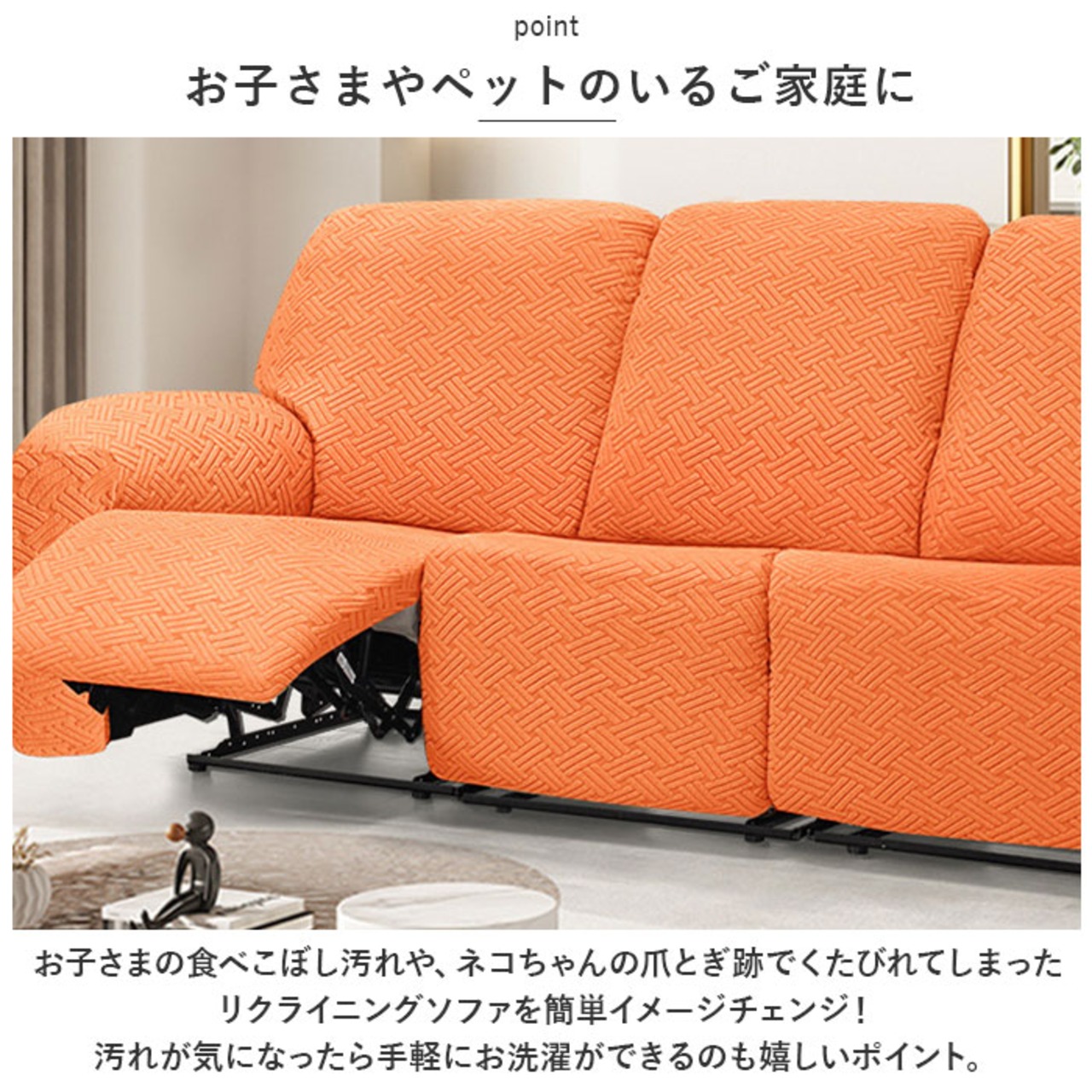 ・タテ・ヨコに程よく伸縮するストレッチ素材が、リクライニングソファの8つのパーツにぴったりフィットして、まるごとフルカバー。