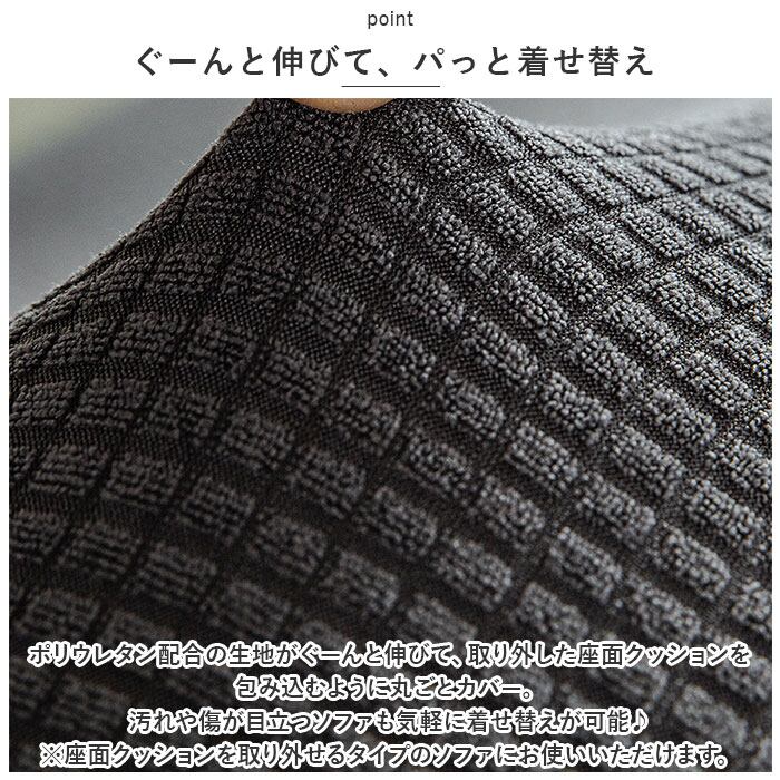・ポリウレタン配合の生地がぐーんと伸びて、取り外した座面クッションを包み込むように丸ごとカバー。汚れや傷が目立つソファも気軽に着せ替えが可能♪(※座面クッションを取り外せるタイプのソファにお使いいただけます。)