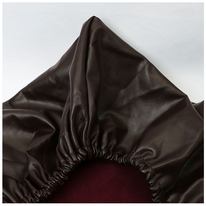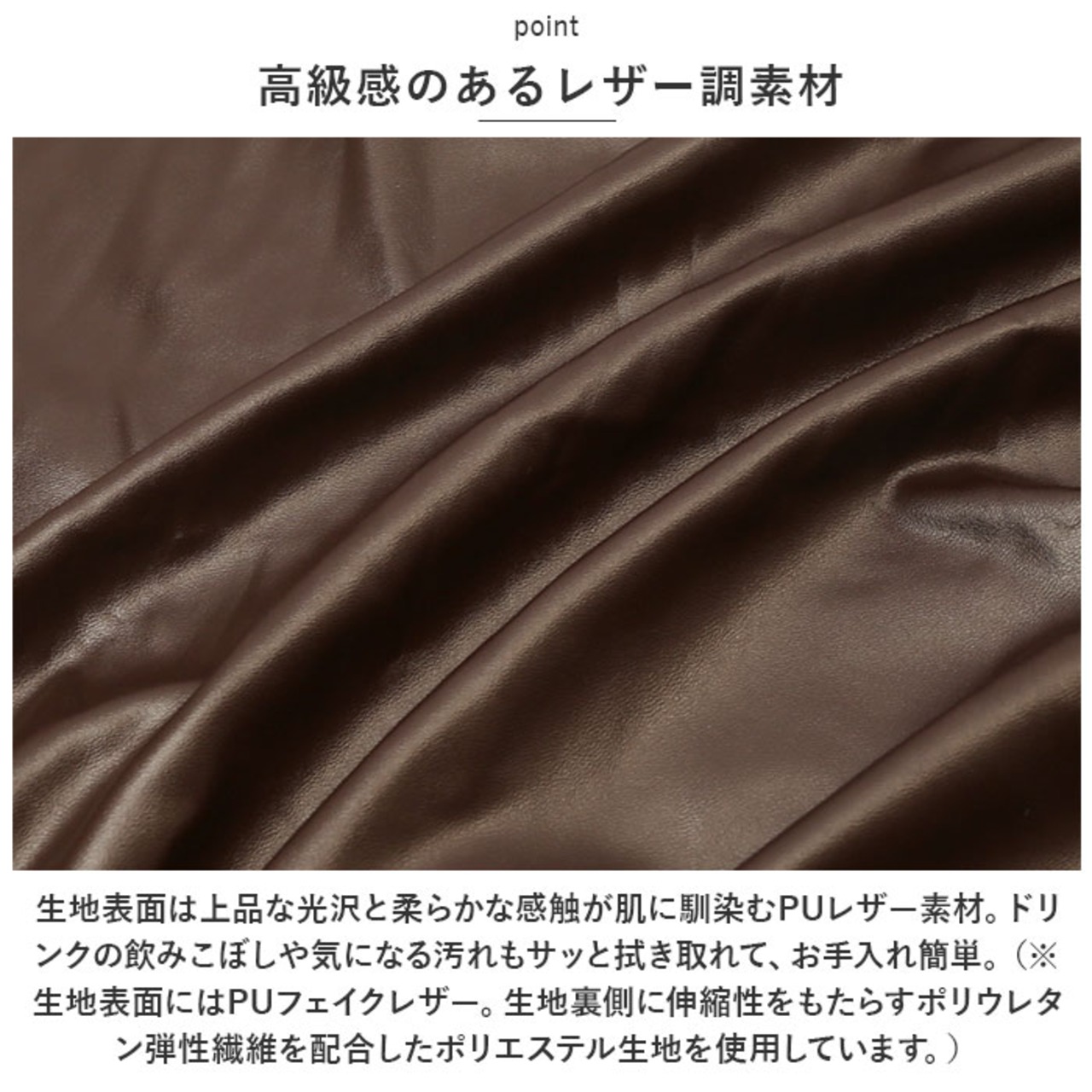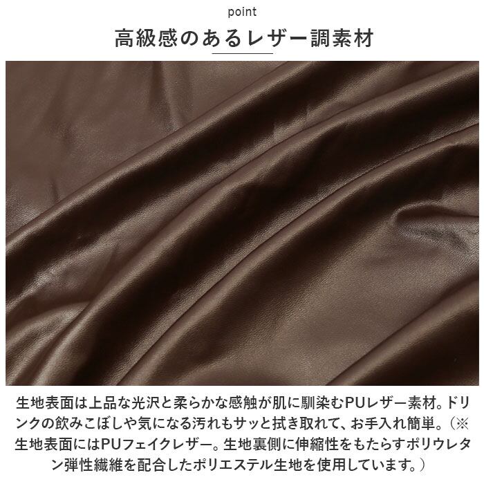・生地表面は上品な光沢と柔らかな感触が肌に馴染むPUレザー素材。ドリンクの飲みこぼしや気になる汚れもサッと拭き取れて、お手入れ簡単。(※生地表面にはPUフェイクレザー。生地裏側に伸縮性をもたらすポリウレタン弾性繊維を配合したポリエステル生地を使用しています。)