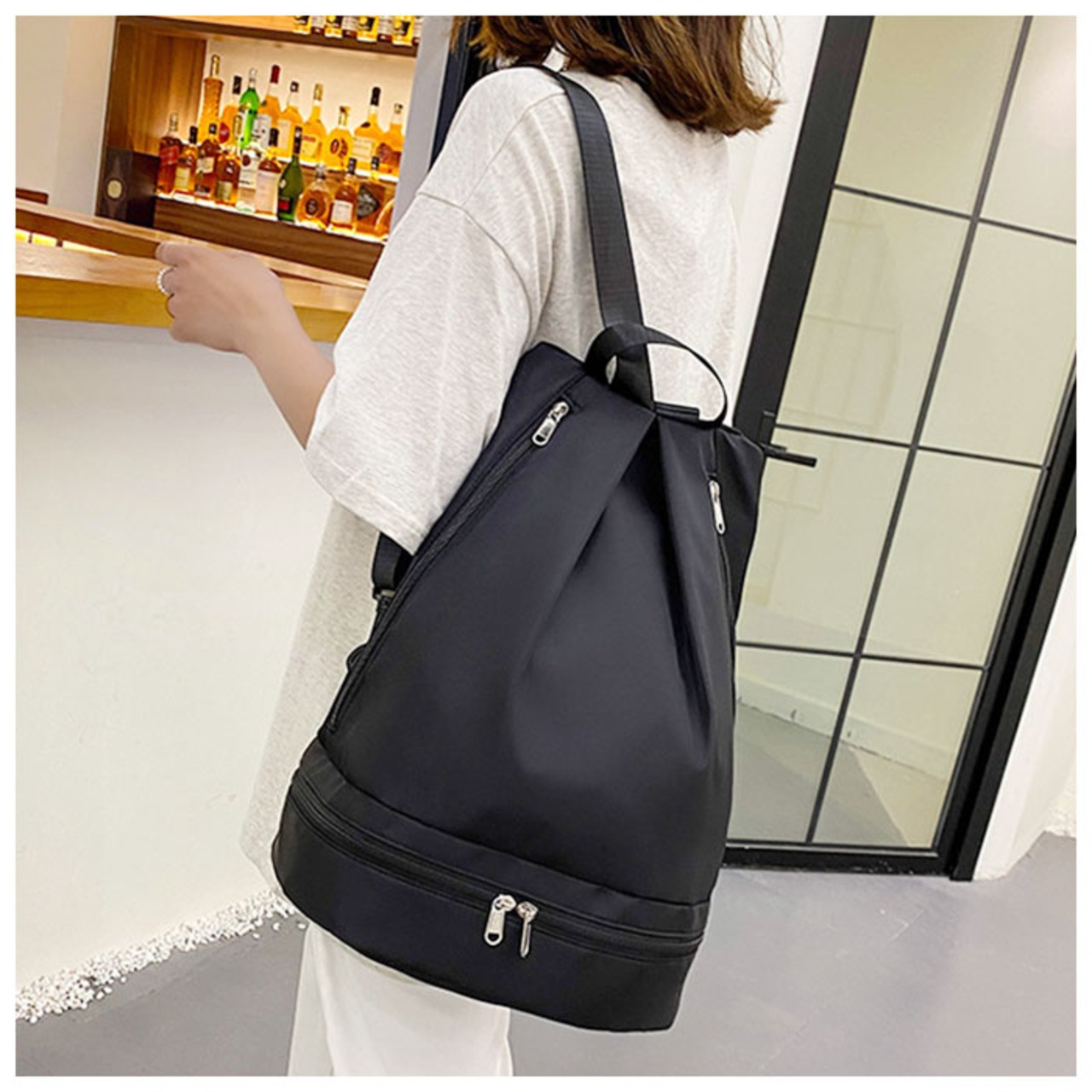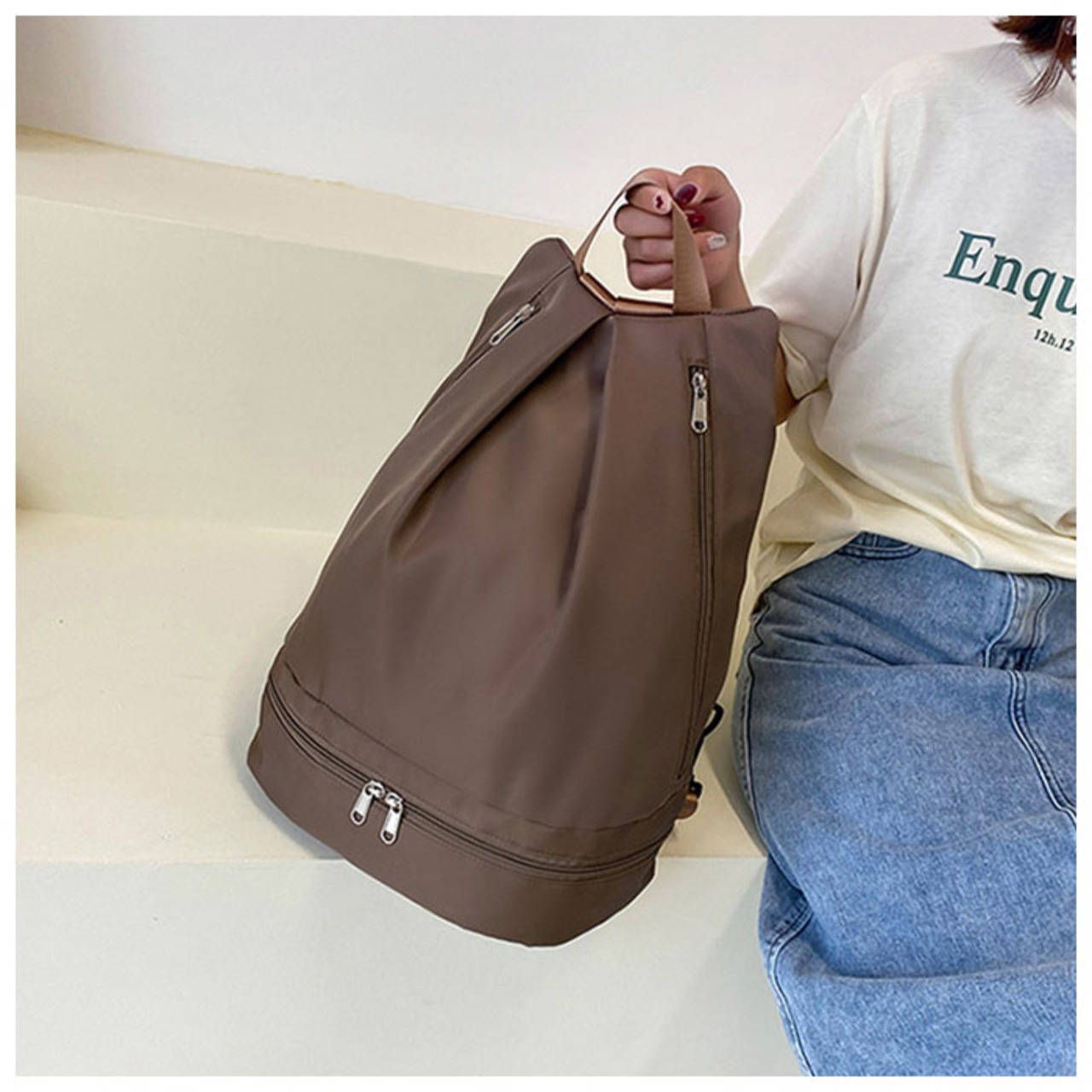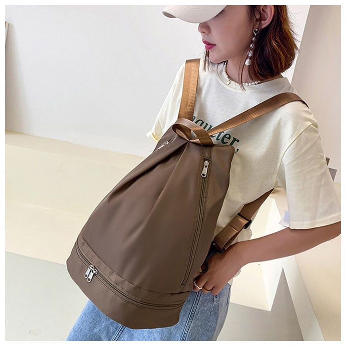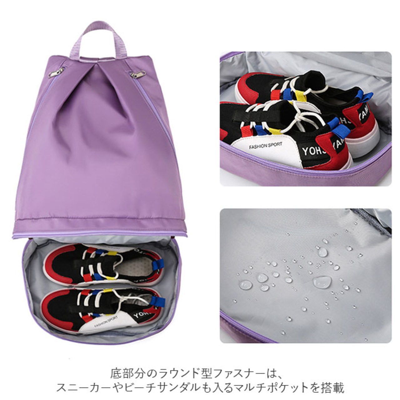 ・底部分のラウンド型ファスナーは、スニーカーやビーチサンダルも入るマルチポケットを搭載。